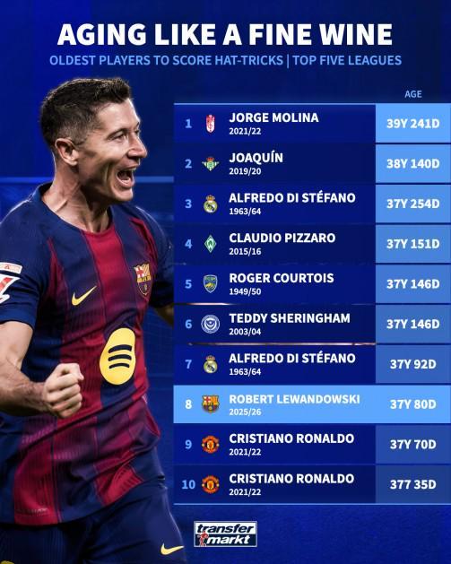 北京时间11月11日,在莱万多夫斯基用帽子戏法帮助巴塞罗那客场4-2战胜塞尔塔之后,德转列出了欧洲五大联赛历史上上演帽子戏法最年长的10位球员,莱万以37岁80天的年纪排名第8,C罗在榜单中占据了两个位置。